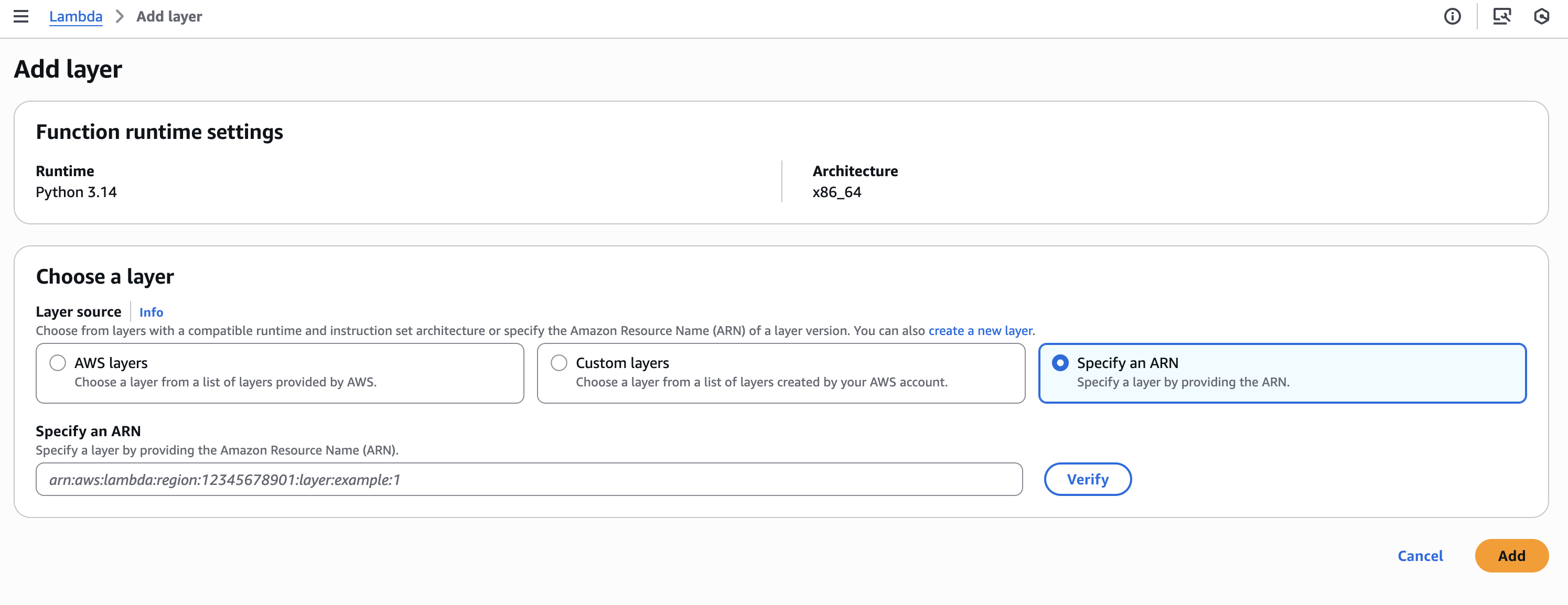 대상 라이브러리에 해당하는 ARN을 외부에서 긁어서 여기에 넣어야 하는 방식인데, 일단 이 ARN을 찾는 과정부터 번거로울 뿐더러 여러개의 라이브러리를 동시에 사용한다고 하면 골치아파진다.그래서 나는 나중에 신규 개발자들도 람다를 구현할 일이 있을 수 있으니, 버전도 올릴 겸 람다 개발 환경을 협업에 유리하게 조성을 했다.