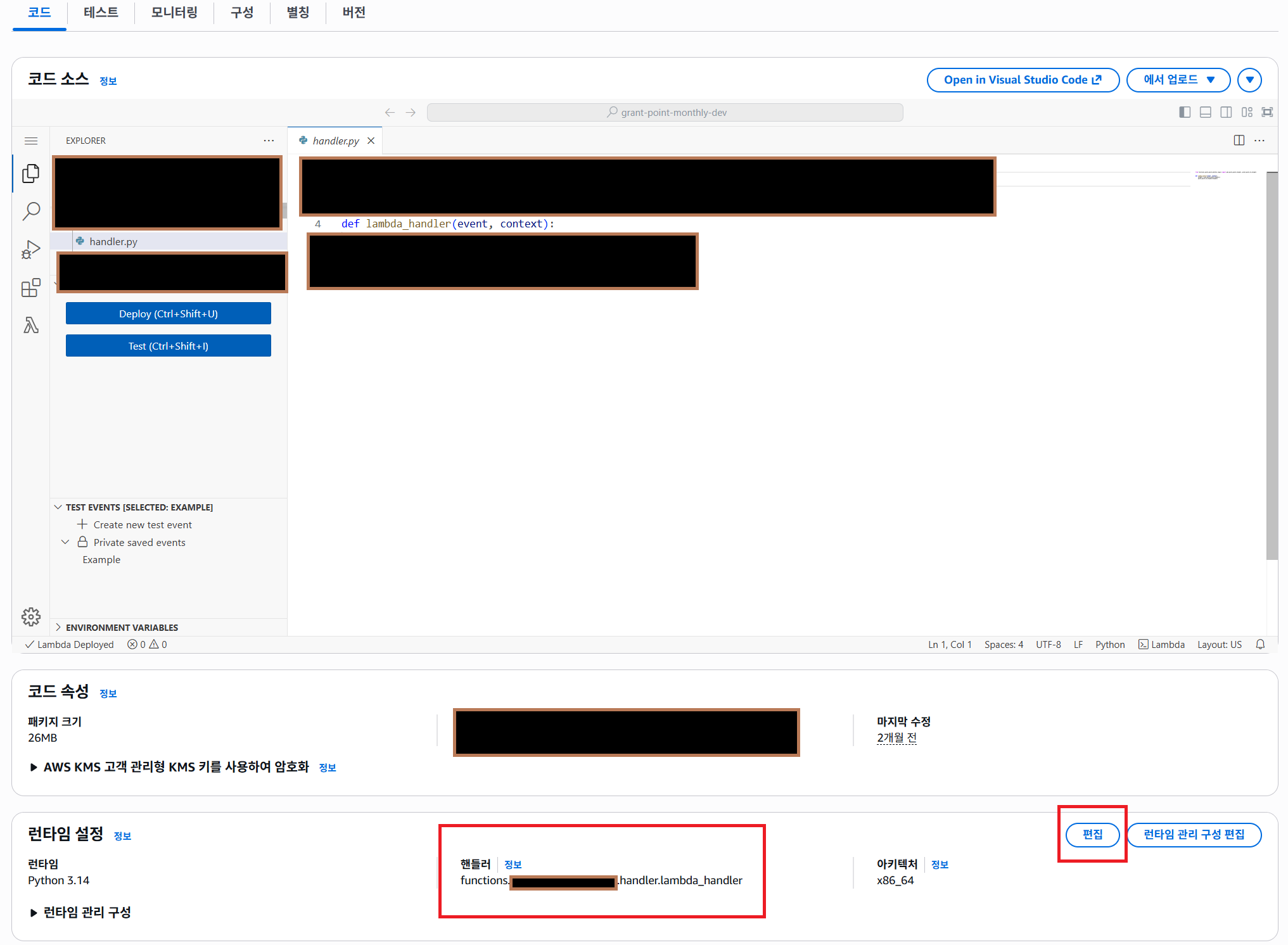 하지만 이대로 람다 함수를 실행하면 작동이 되지 않는다. 런타임 핸들러 함수를 수정해야 하기 때문이다. 런타임 핸들러 함수는 말 그대로 실행 대상의 함수를 의미한다. 따라서 이걸 functions.example_function.handler.lambda_handler 로 수정한다. 즉, 실행 대상 함수의 위치와 그 이름을 작성하면 된다.